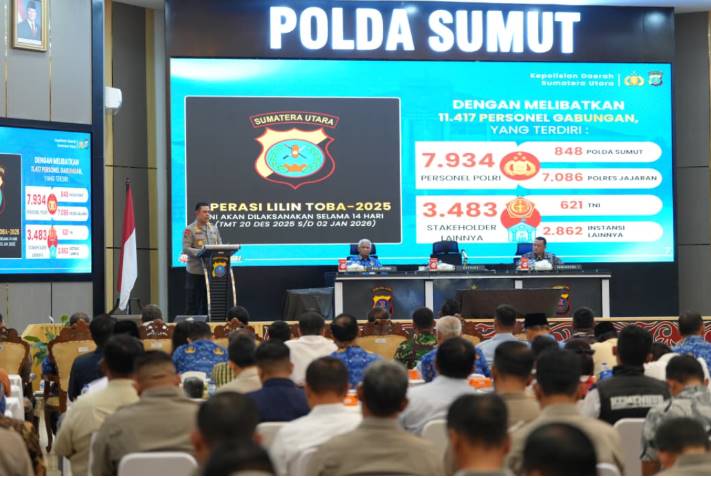 MEDAN, TOPKOTA.co — Polda Sumatera Utara memastikan kesiapan penuh dalam memberikan perlindungan dan pelayanan terbaik kepada masyarakat selama momentum Natal 2025 dan Tahun Baru 2026 melalui Operasi Lilin Toba 2025. Kesiapan tersebut ditegaskan Kapolda Sumut, Irjen Pol Whisnu Hermawan Februanto, dalam Rapat Koordinasi Lintas Sektoral yang digelar di Aula Tribrata Polda Sumut, Rabu (17/12/2025).