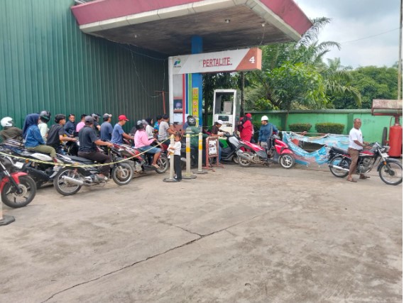 Personil Polsek Indrapura melakukan pengaturan antrian pengisian BBM dan menghimbau masyarakat agar antre dan sabar mengisi Pertamax, pertalite, dan biosolar di tiap mesin BBM.