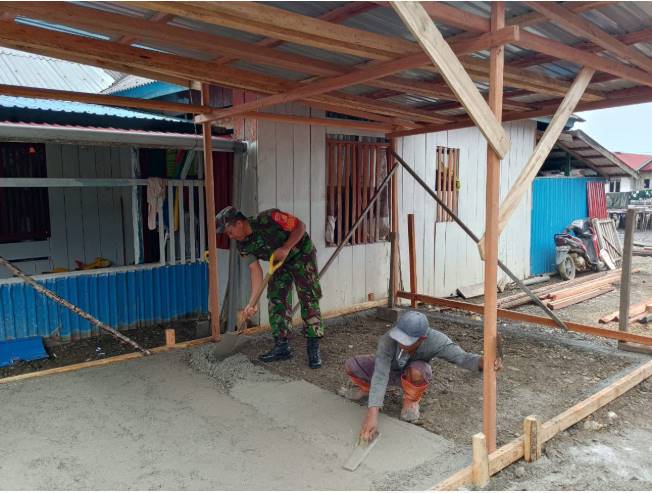 MOROWALI, TOPKOTA.co – Sebagai bentuk kepedulian terhadap warga binaannya, Babinsa Desa Lamontoli, Kecamatan Sambori, Praka Arham, melaksanakan kegiatan bakti sosial dengan membantu salah satu warga merehabilitasi dan melantai teras rumahnya.