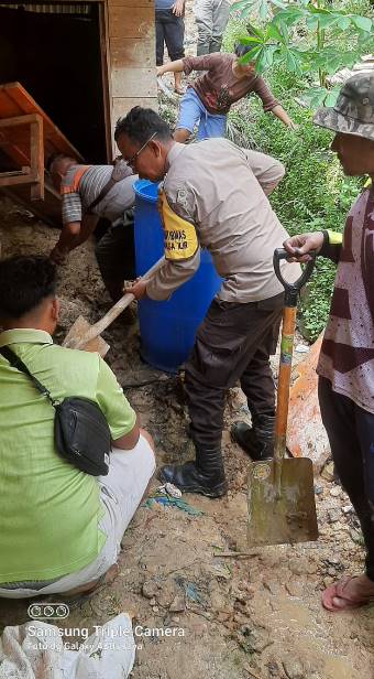Material tanah dan lumpur akibat longsor sempat menimbun sebagian rumah warga dan mengganggu aktivitas masyarakat sekitar. Dengan menggunakan peralatan seadanya, personel kepolisian bersama warga bahu-membahu membersihkan material longsor guna mempercepat pemulihan kondisi lingkungan serta memastikan keamanan warga pascabencana.