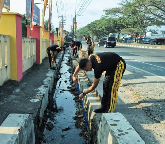 Kegiatan yang dipimpin Komandan Kompi 2 Batalyon A, AKP Alwi Budi Utomo, tersebut difokuskan pada pembersihan parit dan trotoar di jalan lintas Batang Kuis sebagai upaya menciptakan lingkungan yang sehat dan tertata.