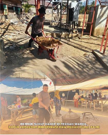 Pada kegiatan tersebut, personel Brimob melaksanakan pengoperasian dapur lapangan guna mendukung kebutuhan logistik personel dan warga sekitar, sekaligus melanjutkan pembersihan rumah warga yang terdampak, yakni rumah Ibu Nurimah dan rumah Bapak Halomoan Manalu. Kegiatan ini dilakukan sebagai bagian dari upaya berkelanjutan untuk membantu warga memulihkan kondisi lingkungan tempat tinggal mereka.