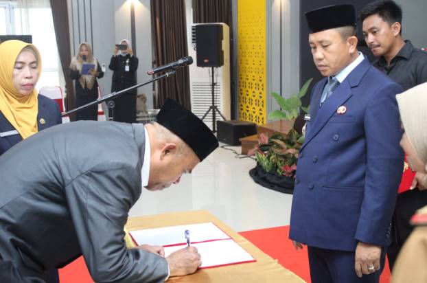Pelantikan yang diawali dengan pembacaan sumpah jabatan, dilanjutkan penandatanganan berita acara sumpah dan naskah pelaksanaan pelantikan oleh Bupati bersama pejabat yang dilantik.