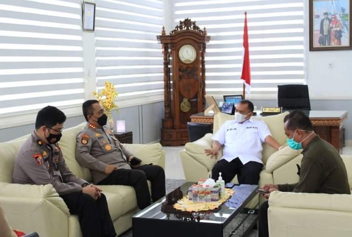 LABUHANBATU, TOPKOTA.co – Bupati Labuhanbatu dr H Erik Adtrada Ritonga MKM terima Kunjungan Dir Pam Obvit Polda Sumut Kombes Pol I Made Oka Putra SIK di Ruang Kerja Bupati Jalan SM Raja Kecamatan Rantau Selatan, Kamis (17/3).