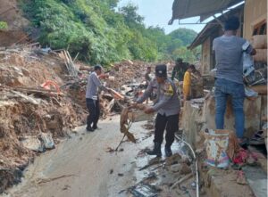 Bhabinkamtibmas Polres Sibolga Bantu Warga Binaannya Bersihkan Sisa Material Longsor Sabtu, 6 Desember 2025