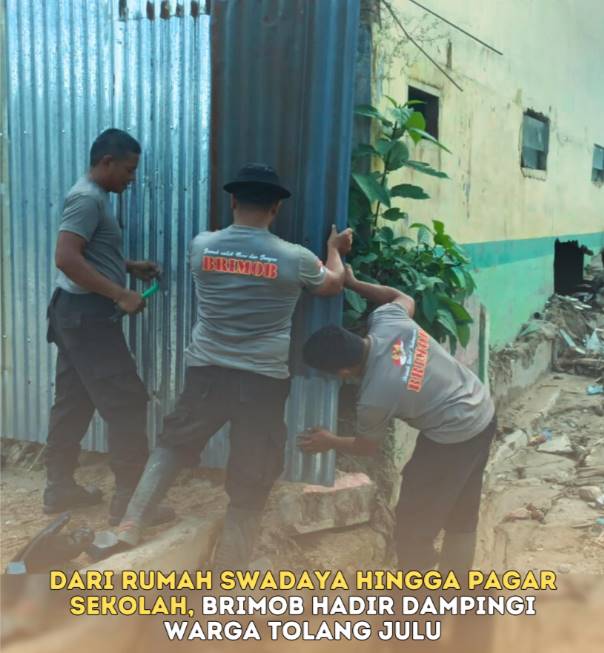 TAPSEL, TOPKOTA.co — Kepedulian terhadap warga terdampak banjir kembali ditunjukkan oleh Satuan Brimob Polda Sumatera Utara bersama masyarakat Desa Tolang Julu, Kecamatan Sayur Matinggi, Kabupaten Tapanuli Selatan. Personel Brimob Batalyon C bergotong royong dengan warga melaksanakan pembangunan rumah swadaya serta membantu pemasangan pagar seng di lingkungan sekolah Madrasah Tsanawiyah (MTs) 4 Tolang Julu, Pada Minggu (1/2/2026),