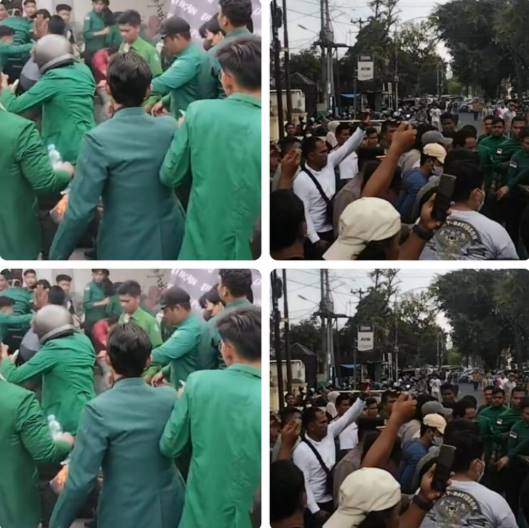 Kericuhan terjadi saat massa hendak membakar ban sebagai bentuk ekspresi protes. Namun, aksi itu dicegah petugas dengan mengambil ban yang sudah disiapkan massa. Situasi kemudian memanas hingga terjadi saling dorong antara mahasiswa dan aparat kepolisian.