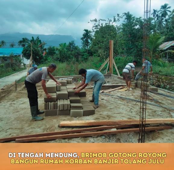 Di Tengah Mendung, Brimob Gotong Royong Bangun Rumah Korban Banjir Tolang Julu