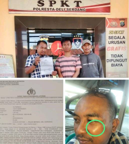 Surat Tanda Terima Laporan nomor : LP/B/1013/X/2025/SPKT/POLRESTA DELI SERDANG/POLDA SUMATERA UTARA pertanggal 10 Oktober 2025 yang di stempel dan tanda tangani oleh a.n. Ka SPKT Resor Kota Deli Serdang, Kanit I IPTU Rihat PolloTampubolon NRP.69070032. Melaporkan dugaan tindak pidana penganiayaan undang-undang nomor 1 tahun 1946 tentang KUHP sebagaimana dimaksud dalam pasal 351 yang terjadi di Jalan Galang dusun 1 desa Purwodadi Kecamatan Pagar Merbau kabupaten Deli Serdang Sumatera Utara pada hari Sabtu tanggal 4 Oktober 2025 sekira pukul 19.30 wib, terlapor atas nama Budi alias Black adapun uraian kejadiannya sebagai berikut pada hari Sabtu tanggal 4 Oktober 2025 sekira pukul 19.30 wib telah terjadi tindak pidana penganiayaan yang dilakukan oleh saudara saya bahwa pelaku datang bertiga ke rumah mencari pelapor dengan cara menunjang pintu rumah pelapor , mendengar informasi dari anak kandungnya saat berada di rumah dan para saksi ( tetangga ) bahwa saya di undang oleh terlapor (BS ) dan di tunggundi rumahnya , selanjutnya pelapor pun mendatangi rumah si pelaku dan bertanya ” Ada apa kau nyari-nyari saya lalu pelaku menjawab – Ya aku nggak soor sama kau ” hingga terjadi dorong-dorongan yang dimana pelaku ( terlapor ) langsung memukul wajah pelapor sehingga wajah pelapor mengalami bengkak dengan demikian pelapor merasa keberatan dan membuat laporan ke Polresta Deli Serdang.