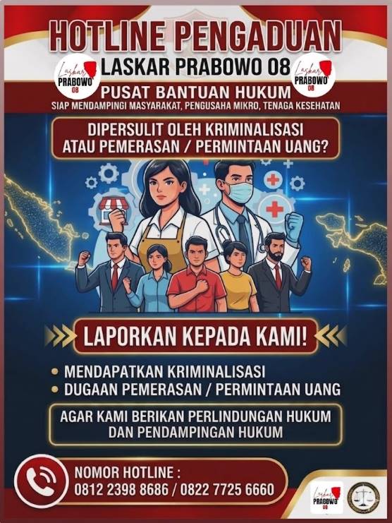 Masyarakat yang mengalami kendala hukum dapat menghubungi Hotline Pengaduan Laskar Prabowo 08 di nomor: