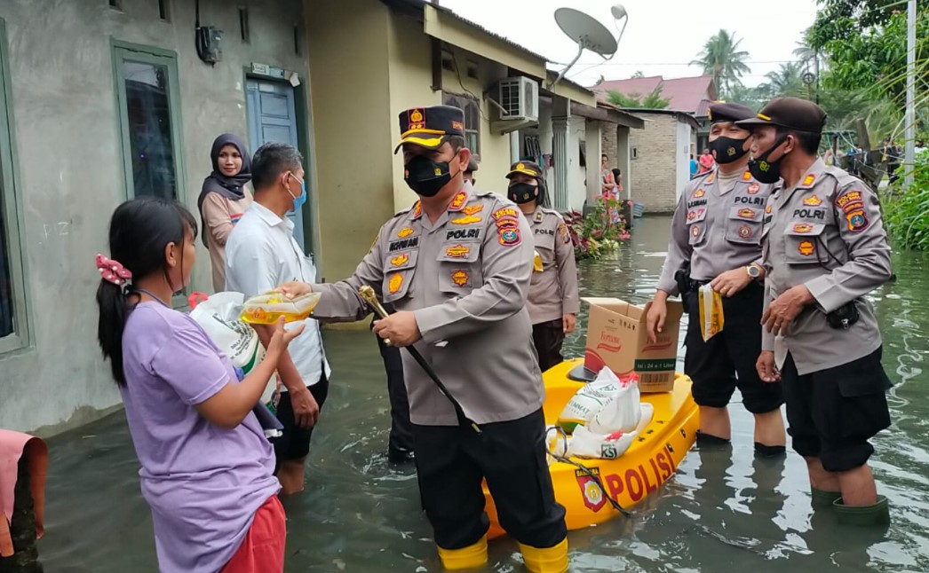 Kedatangan Kapolres Batubara beserta rombongan dan para Pejabat Utama (PJU) Polres Batubara di Dusun II Desa perjuangan turut didampingi Kepala Desa Perjuangan Erwin Junaidi untuk memberikan bantuan sosial paket sembako berupa beras dan minyak goreng kepada warga terdampak korban banjir yang rumahnya di genangi air.