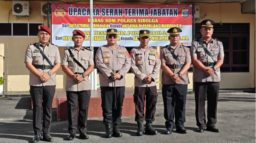 Upacara Sertijab tersebut dipimpin langsung oleh Kapolres Sibolga *AKBP Eddy Inganta, S.H., S.I.K., M.H.* selaku Inspektur Upacara. Bertindak sebagai Perwira Upacara *AKP Syahrizal*, dan Komandan Upacara *Ipda Hutama Karya Siregar, S.H.* Kegiatan ini merupakan bagian dari dinamika organisasi Polri dalam rangka pembinaan karier personel serta penyegaran di lingkungan Polres Sibolga guna meningkatkan kinerja dan pelayanan kepada masyarakat.