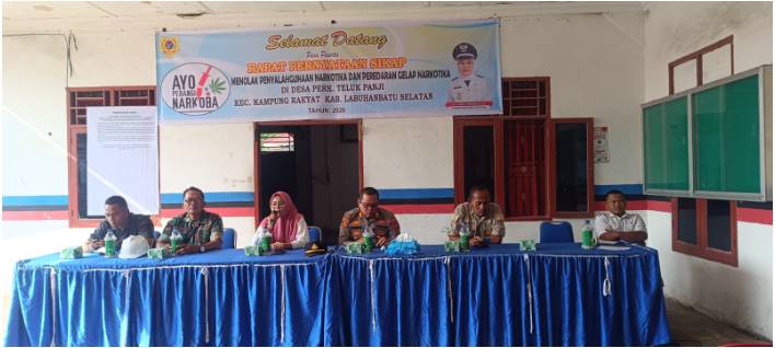 LABUSEL, TOPKOTA.co – Polsek Kampung Rakyat Polres Labuhanbatu Selatan terus menunjukkan komitmennya dalam upaya pemberantasan penyalahgunaan dan peredaran gelap narkotika, Kapolsek Kampung Rakyat AKP Muhammad Ilham Lubis, S.H menghadiri kegiatan rapat pernyataan sikap penolakan narkoba bersama unsur pemerintah desa dan masyarakat di Desa Perkebunan Teluk Panji, Kecamatan Kampung Rakyat, Kabupaten Labuhanbatu Selatan, Rabu (4/2/2026).