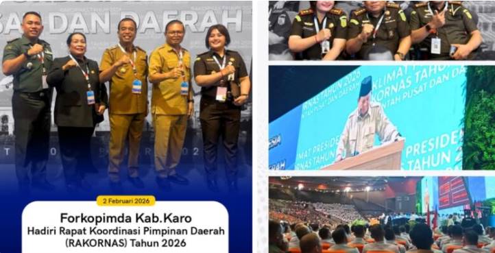 BOGOR, TOPKOTA.co – Kepala Kejaksaan Negeri Karo, Ibu Danke Rajagukguk, S.H., M. Si beserta Forkopimda Kabupaten Karo, menghadiri Rapat Koordinasi Pimpinan Daerah (RAKORNAS) Tahun 2026 di Sentul International Convention Center (SICC), Kabupaten Bogor, Jawa Barat. RAKORNAS ini merupakan upaya untuk mempercepat pelaksanaan berbagai program prioritas Presiden Prabowo Subianto.