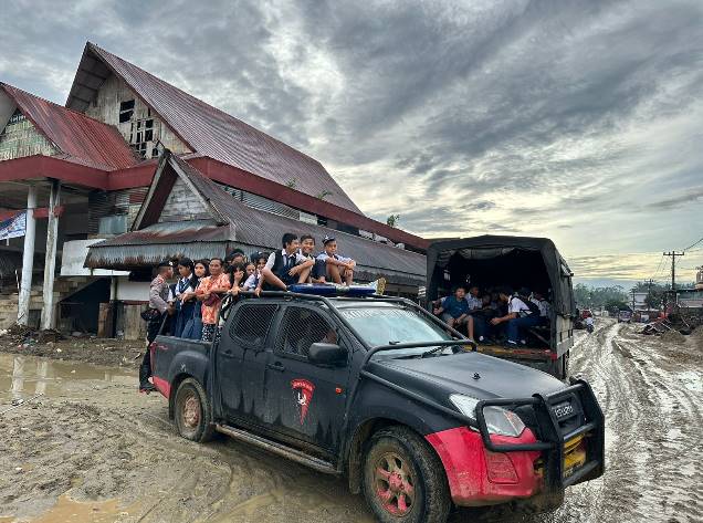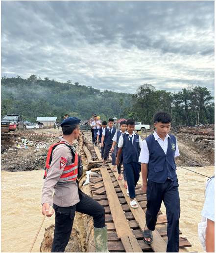 Di tengah kondisi infrastruktur yang belum sepenuhnya pulih, personel Brimob tidak hanya menyediakan sarana transportasi, tetapi juga dengan sigap membantu siswa-siswi menyeberangi jembatan sementara yang dibangun pascabanjir bandang. Langkah ini dilakukan demi memastikan anak-anak tetap dapat mengikuti kegiatan belajar mengajar dengan aman dan tepat waktu.