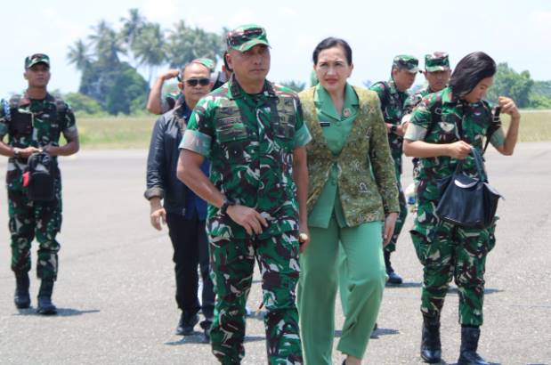 Ketibaan Pangdam XXIII/PW, Mayor Jenderal TNI AD Jonathan Binsar Parluhutan Sianipar bersama rombongan disambut dengan pengalungan bunga, bertempat di Bandar udara (Bandara) Maleo Morowali, Desa Bente, Kecamatan Bungku Tengah, Selasa (30/9/2025).