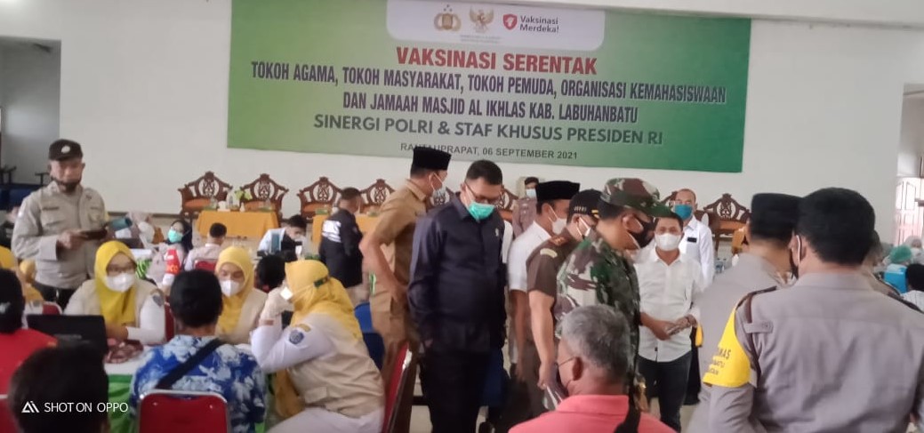 LABUHANBATU, TOPKOTA.co – Sebanyak 100 vial vaksin diperuntukkan bagi 1000 masyarakat Labuhanbatu dalam kegiatan vaksinasi masal atau vaksinasi merdeka secara serentak di aula Asrama Haji Ujungbandar Rantauprapat Kecamatan Rantau Selatan, Senin (6/9/). Kegiatan ini merupakan koordinasi antara Staf Kepresidenan, Polri dan DMI.