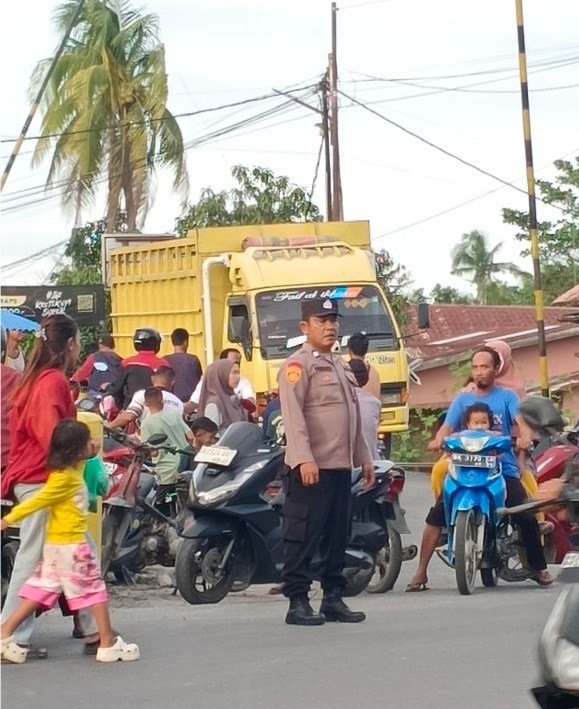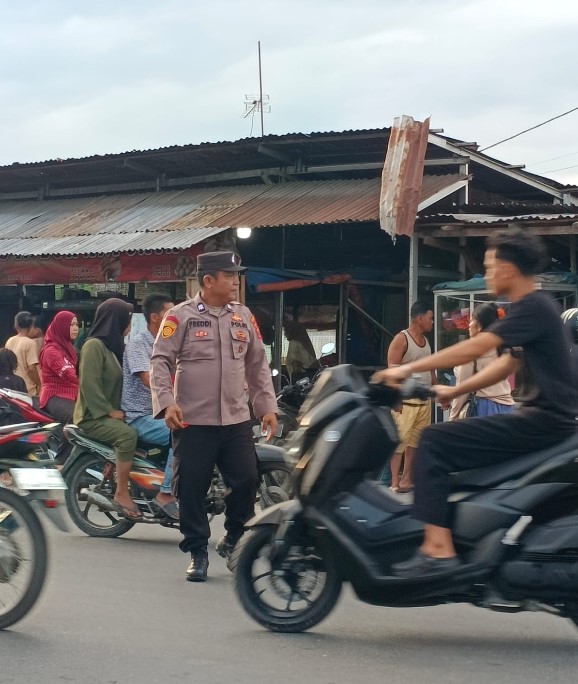Personil Polres Batubara melakukan monitoring kegiatan Pasar Tumpah dan memberikan rasa aman bagi masyarakat, serta mengatur arus lalu lintas untuk mencegah kemacetan.