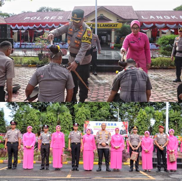 Rangkaian upacara diawali dengan laporan Komandan Upacara, penghormatan pasukan, pelantikan dan penyematan tanda pangkat kepada personel yang naik pangkat, serta tradisi penyiraman sebagai simbol penyucian dan tanggung jawab baru yang dilakukan oleh Inspektur Upacara didampingi Ketua Bhayangkari Cabang Langkat. Kegiatan dilanjutkan dengan amanat Inspektur Upacara dan pembacaan doa.