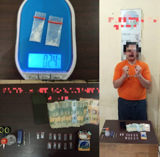 Dalam penangkapan tersebut, petugas berhasil mengamankan barang bukti berupa 2 (dua) bungkus plastik klip bening yang didalamnya diduga berisikan narkotika jenis Sabu dengan brutto 0,24 (nol koma dua empat)Gram,1 (satu) buah kaca pirex, 1 (satu) bungkus kotak rokok merek L.A, 1 (satu) buah jarum suntik, 1 (satu) buah sekop sabu, 10 (sepuluh) bungkus plastik klip bening kosong, 1 (satu) buah Hp android merek vivo, 1 (satu) buah mancis, 1 (satu) buah alat penghisap sabu ,1 (satu) buah gunting dan Uang tunai sebesar Rp. 40.000 . (Empat puluh ribu rupiah).