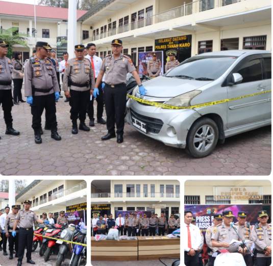 Kapolres juga memperlihatkan sejumlah barang bukti hasil kejahatan berupa sepeda motor dan mobil. Sebagian kendaraan tersebut tidak dilengkapi bukti kepemilikan dan diduga telah diganti nomor rangka maupun nomor mesin.