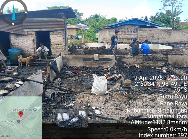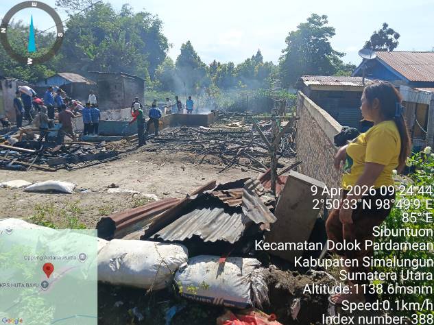 SIMALUNGUN, TOPKOTA.co – Kepanikan melanda warga Kampung Tempel, Dusun Hutabayu, Nagori Buttu Bayu Pane Raja, Kecamatan Dolok Pardamean, Kabupaten Simalungun, ketika kobaran api tiba-tiba melahap permukiman mereka pada Kamis pagi, 09 April 2026, sekira pukul 07.00 WIB. Dalam tempo yang sangat singkat, diperkirakan hanya sekitar satu jam, si jago merah berhasil meluluh lantakkan empat unit rumah penduduk sekaligus dengan kerugian materiil ditaksir mencapai Rp 250.000.000,-. Beruntung, tidak ada korban jiwa dalam musibah yang menyayat hati ini. Polsek Dolok Pardamean langsung bergerak cepat ke lokasi begitu informasi diterima.