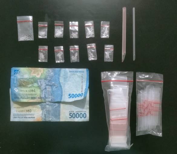 Dari tangan tersangka, petugas mengamankan sejumlah barang bukti berupa uang tunai Rp100.000, sebelas plastik klip transparan berisi butiran kristal diduga sabu, dua buah skop terbuat dari pipet, serta dua bungkus plastik klip transparan kosong.