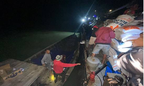 Bantuan yang disalurkan berupa 50 ton beras dan bahan bakar solar, yang digunakan untuk mendukung operasional perahu-perahu masyarakat dalam mengangkut logistik dari KRI ke darat. (Ayu)