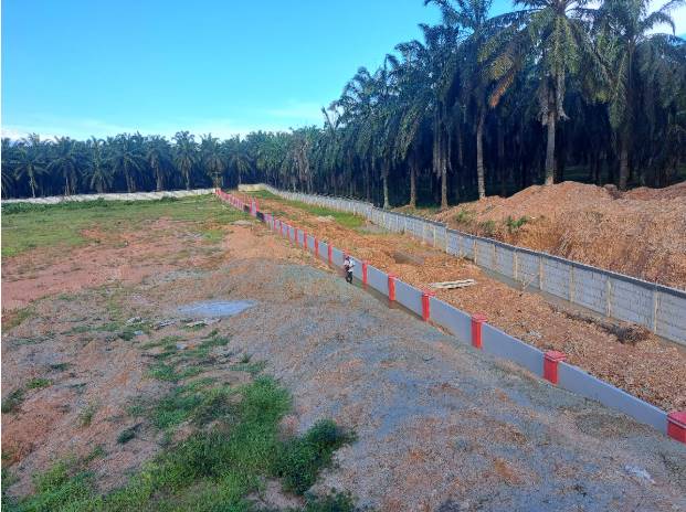 Terlihat gundukan tanah di area ujung pintu masuk lokasi, sedangkan pagar dibangun di bawah gundukan tersebut dan tidak terlihat adanya sistem drainase atau saluran pembuangan air, yang berpotensi menyebabkan genangan saat hujan.