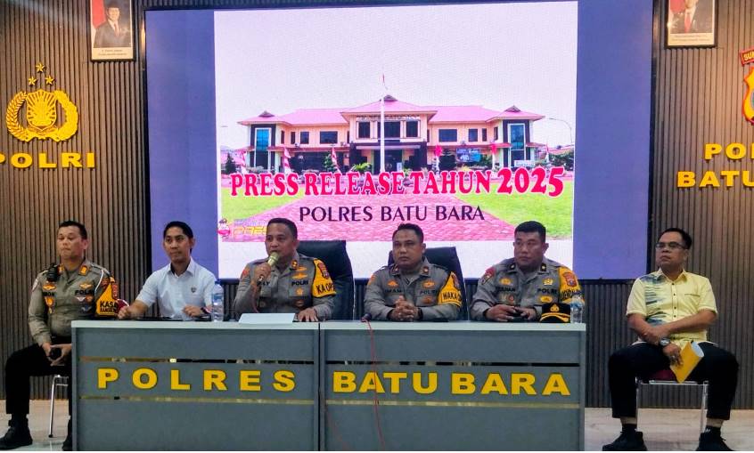 BATUBARA, TOPKOTA.co – Polres Batu Bara Polda Sumatera Utara mencatat capaian signifikan dalam penegakan hukum sepanjang 2025. Konferensi pers rilis akhir tahun dipimpin langsung Kapolres Batu Bara AKBP Doly Nelson HH Nainggolan, didampingi Wakapolres Kompol Imam Alriyuddin, SH, MH, dan para Pejabat Utama (PJU) Polres Batu Bara.