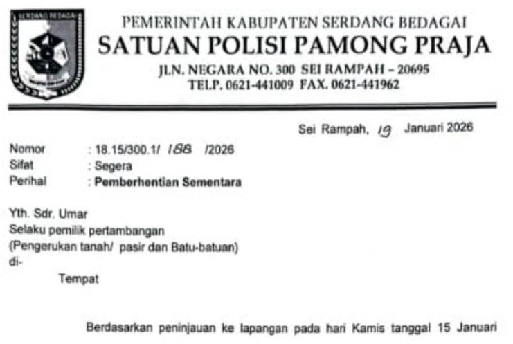 SERDANG BEDAGAI – Satuan Polisi Pamong Praja (Satpol PP) Kabupaten Serdang Bedagai (Sergai) mengeluarkan surat Pemberhentian Sementara Kegiatan Pertambangan kepada Yth.