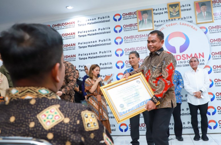 Penghargaan diserahkan langsung oleh Kepala Ombudsman RI Perwakilan Sumut Abyadi Siregar disaksikan oleh Gubernur Sumatera Utara Edy Rahmayadi dan pimpinan Ombudsman RI Dadang Suharmawijaya di Kantor Ombudsman Perwakilan Sumut Jalan Sei Besitang Medan, Selasa (26/1/2023).