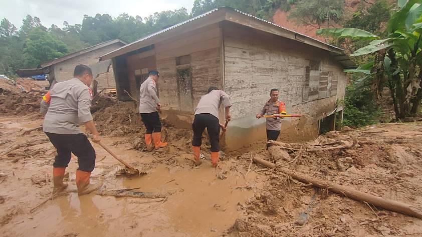 Tak hanya fokus pada evakuasi, personel Brimob juga melaksanakan pembersihan rumah warga lainnya, yakni milik Bapak Hodini Panggabean. Dengan dukungan peralatan SAR yang lengkap, proses pembersihan material lumpur dan sisa longsoran dilakukan hingga rumah tersebut kembali layak digunakan sementara waktu.