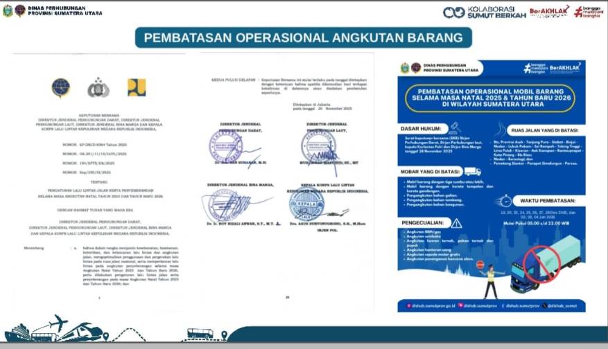 MEDAN, TOPKOTA.co — Dalam rangka menjamin kelancaran arus lalu lintas serta meningkatkan keselamatan dan kenyamanan masyarakat selama perayaan Natal 2025 dan Tahun Baru 2026, Polda Sumatera Utara memberlakukan pembatasan operasional angkutan barang di sejumlah ruas jalan utama wilayah Sumatera Utara.