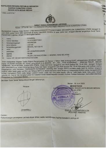 Berdasarkan Laporan Polisi Nomor:LP/B/184/VI/2025/SPKT POLRESTABES MEDAN POLDA SUMATERA UTARA Tanggal 02 Juni 2025 Pukul 19:31 Wib bertempat dikantor Kepolisian tersebut.