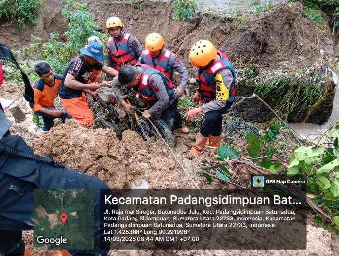 Tidak hanya fokus membersihkan jalan, personel Brimob juga terlibat dalam proses evakuasi kendaraan yang tertimbun. Sebuah sepeda motor Honda CBR 150 cc yang terseret dan jatuh ke jurang sedalam sekitar lima meter berhasil diangkat dengan aman oleh tim Brimob Polda Sumut.
